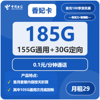 20-60周岁可申请|自主激活|185G流量|首月免月租 电信香妃卡...