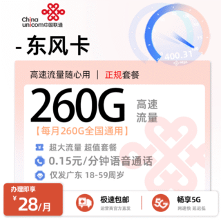 广东联通套餐2026新套餐:联通东风卡28元260G通用流量
