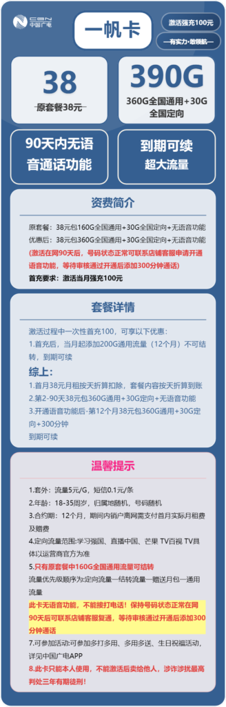 - 对浙江用户:额外的100G浙江省内通用流量让这款卡的价值达到顶峰,相当于每月拥有320G通用流量,本地使用几乎无压力。