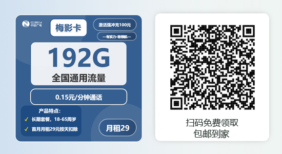 湖南广电梅影卡套餐:29元192G通用流量长期套餐