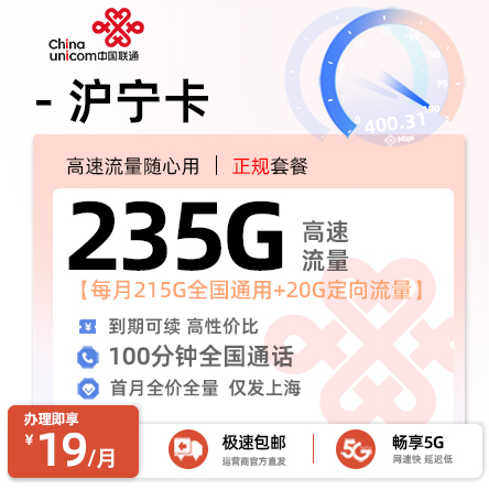 215G全国通用流量占据绝对主导,使用自由度高,不受定向APP限制;20G定向流量作为补充。同时,号码归属地固定为上海,对于在上海生活、工作、办理业务、需要本地号码的用户而言,这是重要的便利和信任基础。