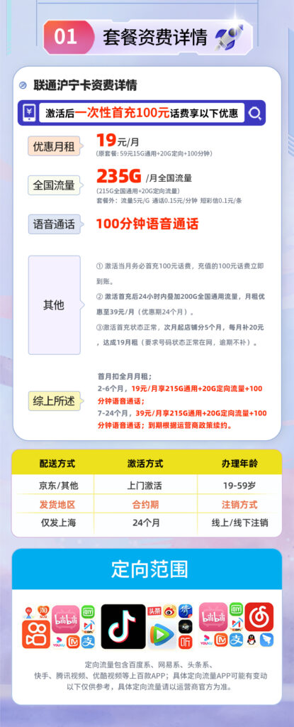 此卡 仅限收货地址在上海市的用户办理。运营商会严格审核地址,任何非上海地址都将导致订单失败。 - 24个月合约期,适合长期使用者