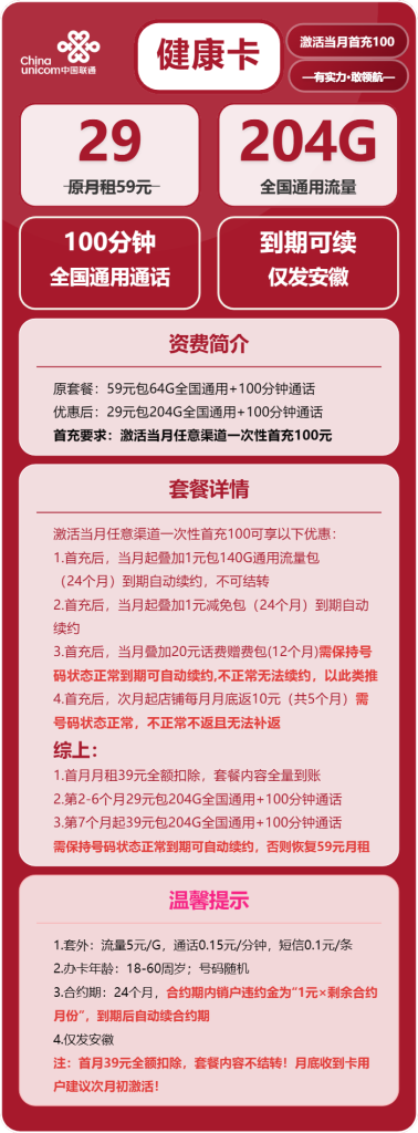 安徽联通流量卡套餐2025新套餐:联通健康卡29元包204G全国通用+100分钟+可选号