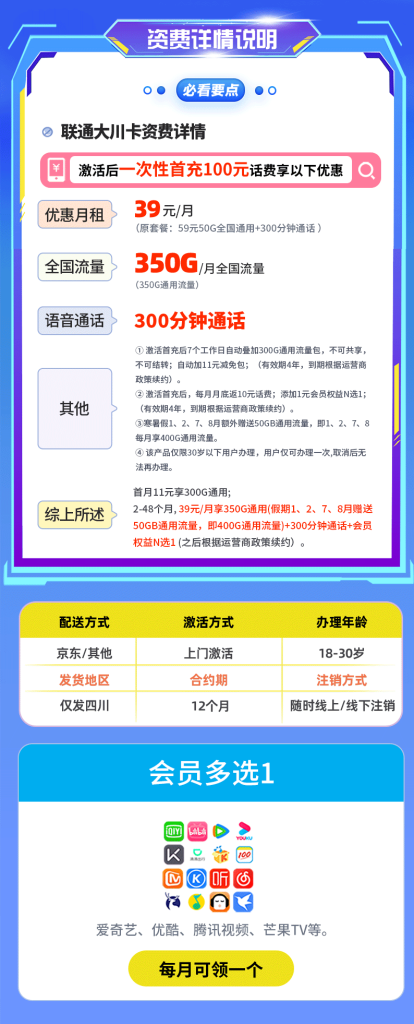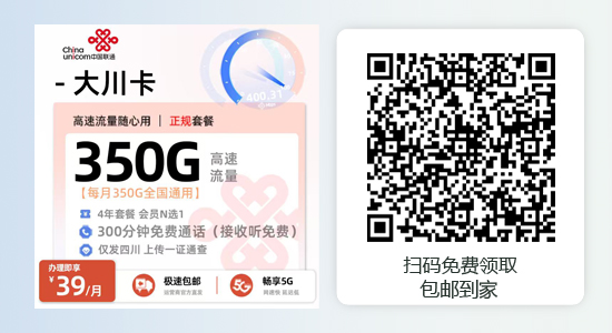 四川联通流量卡推荐,联通大川卡39元350G通用+300分钟通话+会员权益。