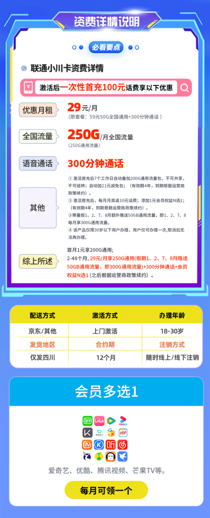 四川联通流量卡推荐,联通小川卡29元250G通用+300分钟+会员权益,只发四川
