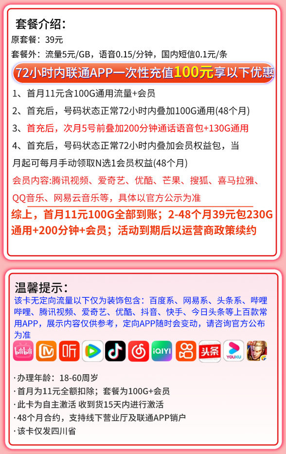 - 激活与充值:收到卡后,请在 15天内 按说明书完成自主激活。激活后,务必在72小时内通过中国联通APP一次性充值100元话费,这是享受全部优惠的关键步骤!