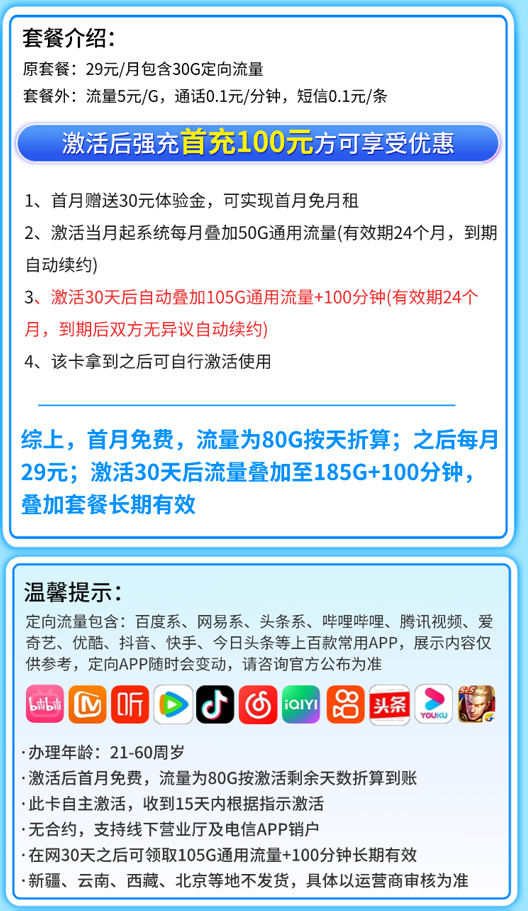 ③ 激活30天后起:29元/月享185G流量(155G通用+30G定向)+100分钟通话