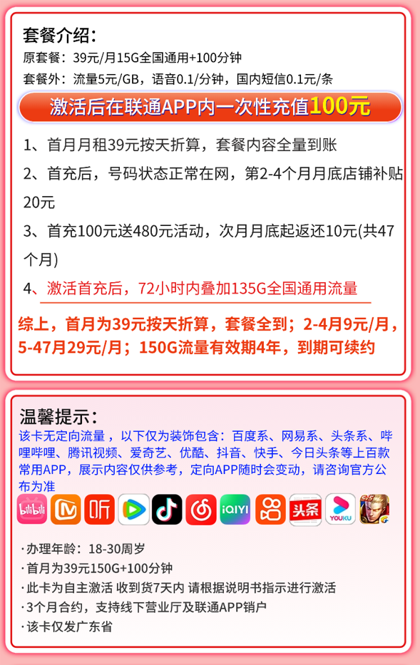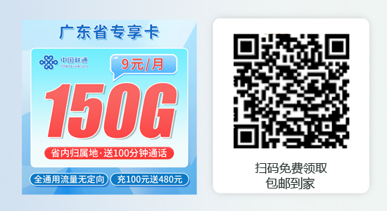 月租9元流量卡,联通广东卡9元150G+100分钟,18-30岁申请,只发广东。