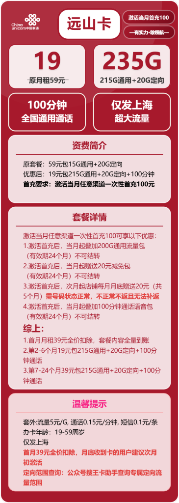 上海流量卡哪个最划算,联通远山卡19元235G+100分钟,上海联通流量套餐