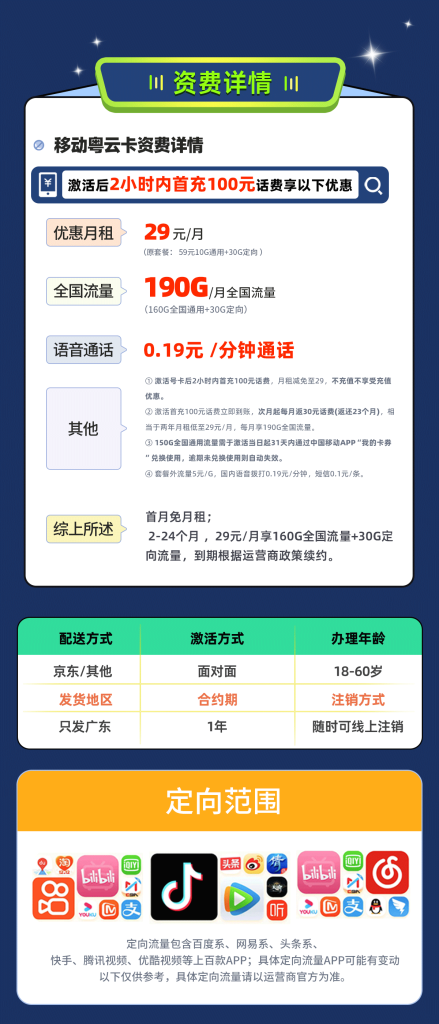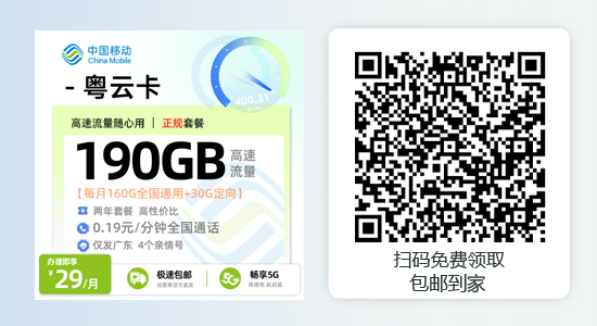 广东移动流量卡套餐,29元190G流量+0.19元/分钟通话,首月免费流量卡
