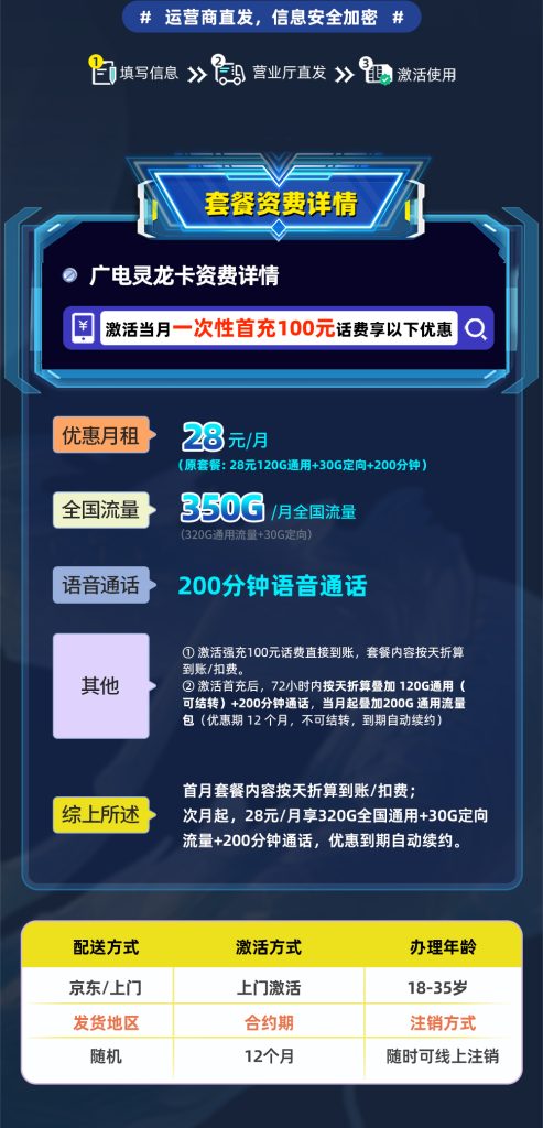 广电长期套餐大流量卡怎么办理,广电灵龙卡28元350G+200分钟,流量可结转。