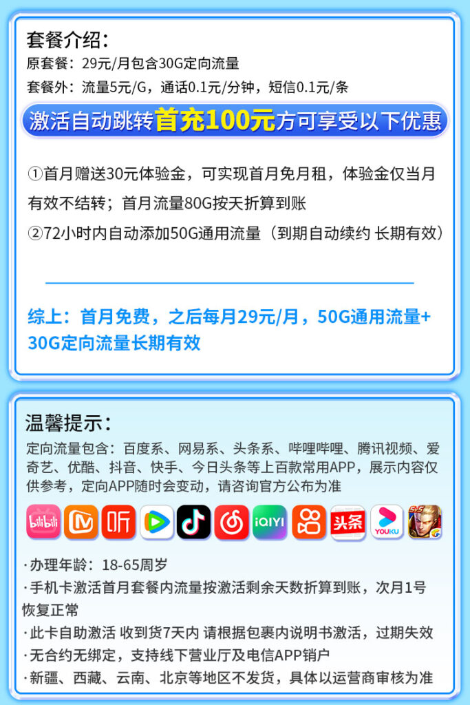 浩子给大家带来一款高性价比的电信长期流量卡,主打大家关注的 “无合约期”“首月免费” 核心优势。这款 电信远航卡,月租长期29元,享80G全国流量,真正实现使用自由,特别适合需要一张稳定、省心副卡的朋友。下面浩子为你做一次深度透明的拆解。