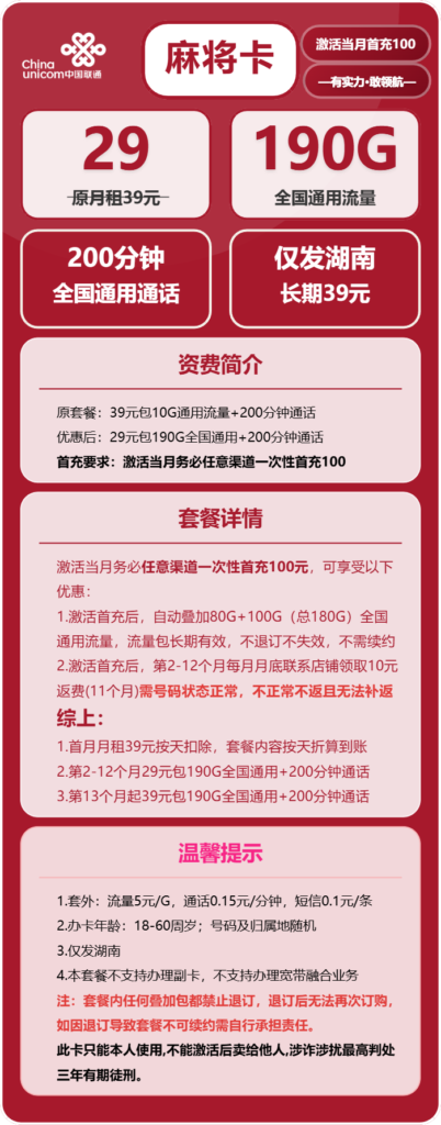 联通麻将卡套餐:29元190G全国通用流量+200分钟通话