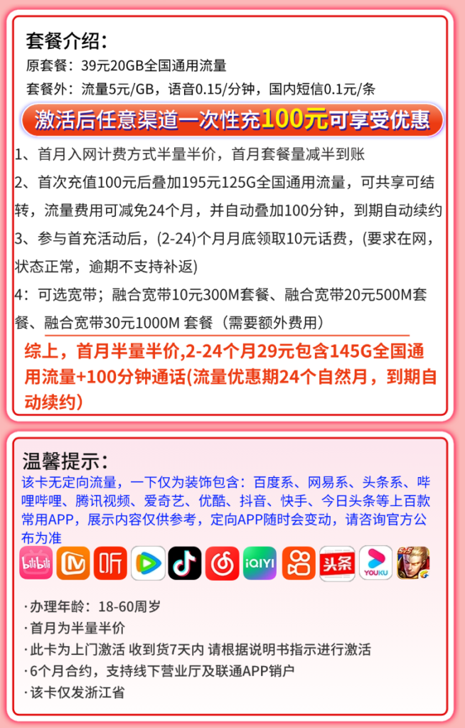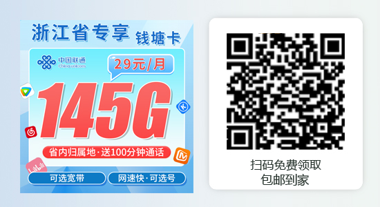 浙江联通流量卡套餐介绍:联通钱塘卡29元145G全国通用+100分钟