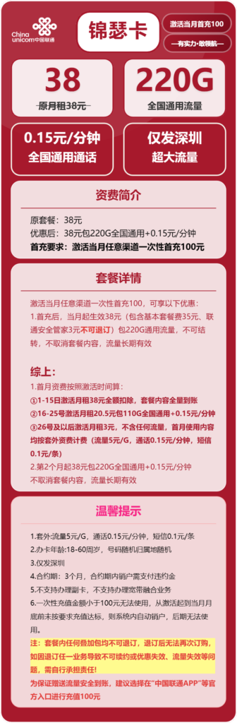 深圳联通大流量卡套餐,联通锦瑟卡38元包220G全国通用流量,只发深圳!