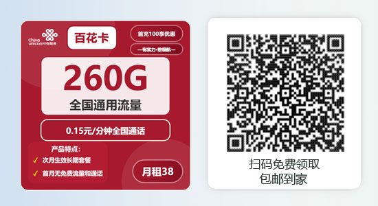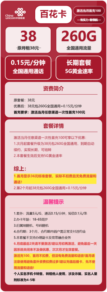联通百花卡:38元月租享260G全国通用流量,可结转+5G黄金速率的长期套餐