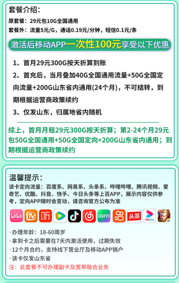 | 优惠后套餐 | 第2-24个月:29元/月 = 50G全国通用 + 50G全国定向 + 200G山东省内通用 首月:29元,套餐内容按天折算 | 核心卖点:每月300G总流量,其中200G为省内通用,对主要在山东活动的用户非常实用。 |