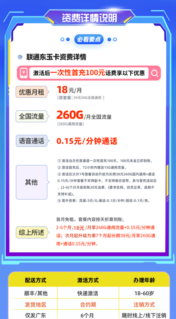 | 优惠后套餐 | 首月免租,流量按天折算;2-6月18元/月;第7个月起长期38元/月,均享260G通用流量+0.15元/分钟通话 | 短期低价+长期稳定,纯通用流量无定向套路 |