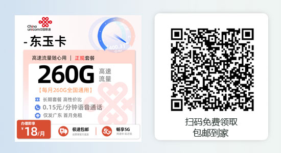 广东联通东玉卡推荐:18元享260G通用流量,广东专属长期流量卡