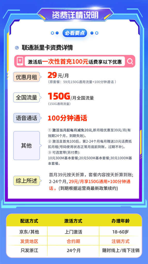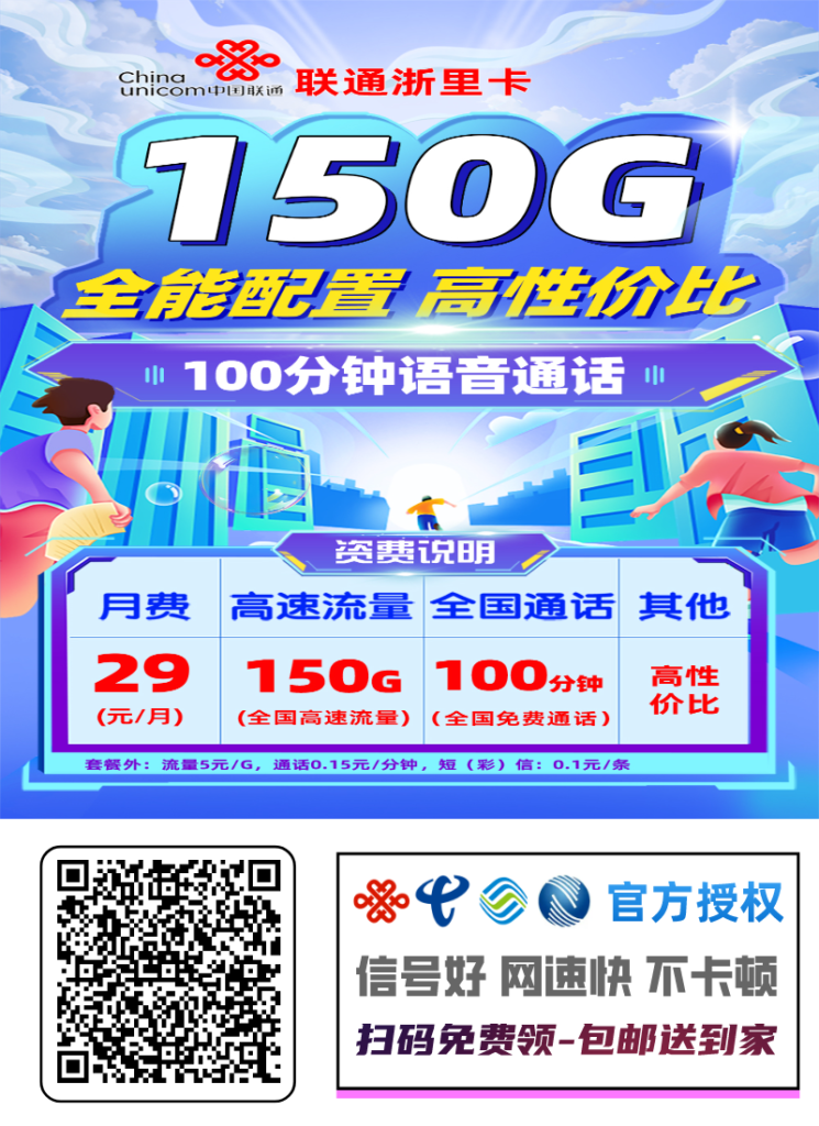 浙江联通浙里卡推荐:29元150G通用流量+100分钟,浙江用户的宽带融合神卡!