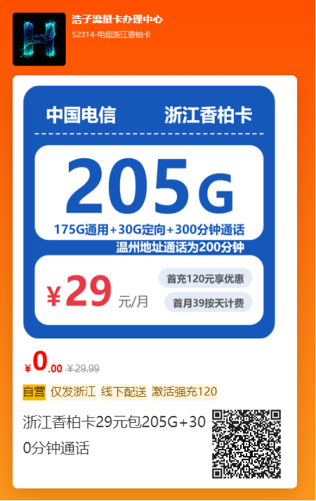 浙江电信香柏卡推荐:29元205G流量+300分钟通话,浙江用户的长期省心之选!