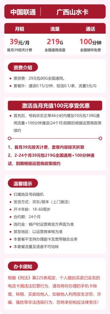 这张广西山水卡,专为广西用户打造,39元就能拿下219G全国通用流量+100分钟通话,优惠期长达24个月!全部是通用流量,没有定向套路,走到哪用到哪。首月按天折算,京东/顺丰上门激活。本文我将把这卡的所有优缺点扒干净,帮你判断值不值得办。