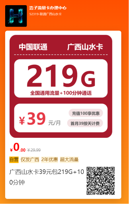 广西联通山水卡推荐:39元219G全国通用流量+100分钟通话,广西用户的流量巨无霸!