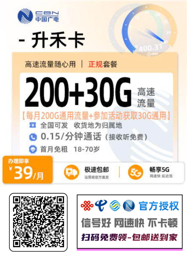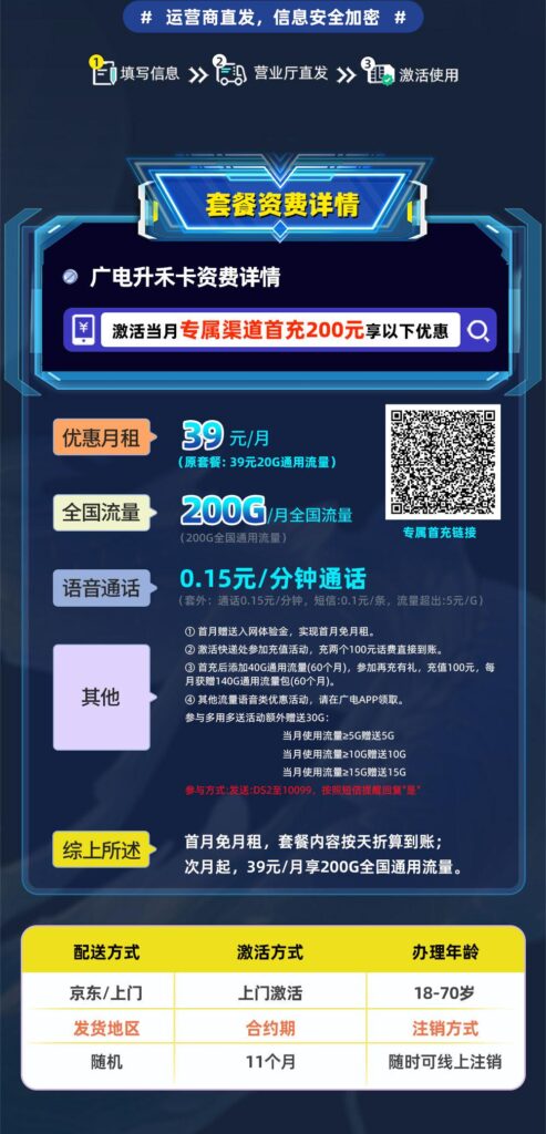 广电升禾卡推荐:39元200G全国通用流量,稳定5年套餐!