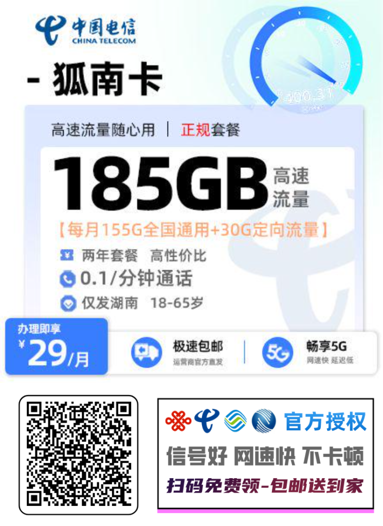 大家好,我是浩子。今天介绍的这张2026年最新电信狐南卡,月租只要29元,就能享受155G全国通用流量+30G定向流量,只支持湖南地区申请。套餐正规,运营商直发,官方可查,性价比非常高。