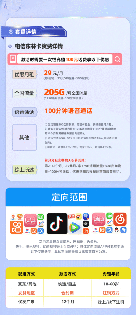 本文介绍2026最新广东电信东林卡套餐,月租29元,含175G全国通用流量 + 30G全国定向流量 + 100分钟通话,只支持广东省内申请,正规运营商直发,官方可查。
