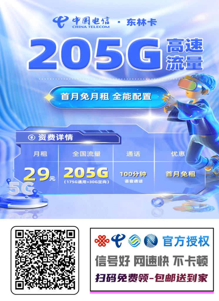 广东电信流量卡套餐:电信东林卡29元205G+100分钟