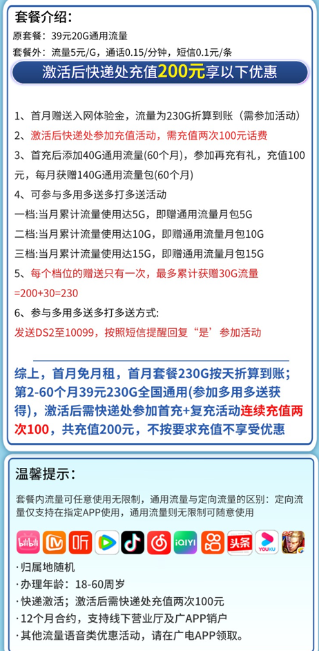 | 优惠后套餐 | 第2-60个月:39元/月 包含:230G全国通用流量 优惠期60个月(5年) | 230G全通用,没有定向套路 |