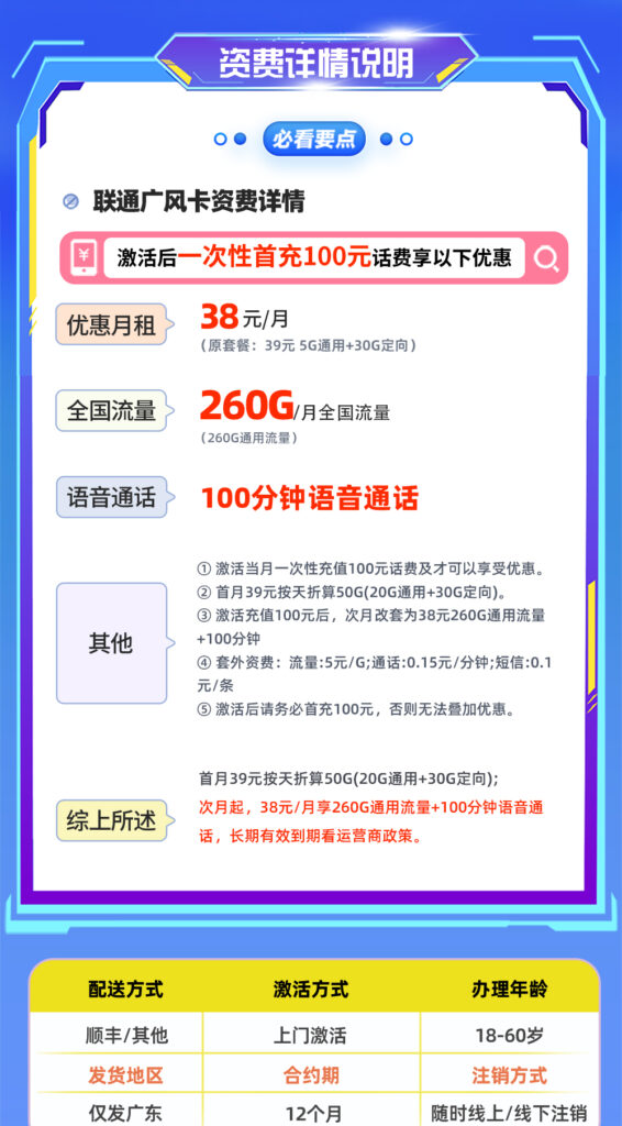 重点提醒:激活后务必首充100元,否则次月无法转为38元260G套餐。该卡为广东联通流量卡,收货地址必须在广东省内。