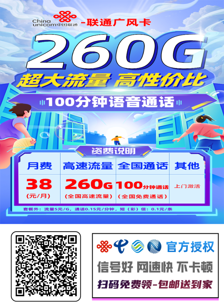 2026新款广东联通套餐——广风卡正式上线,月租38元,含260G全国通用流量 + 100分钟通话,仅限广东省内申请。正规运营商发卡,官方可查,实名激活。