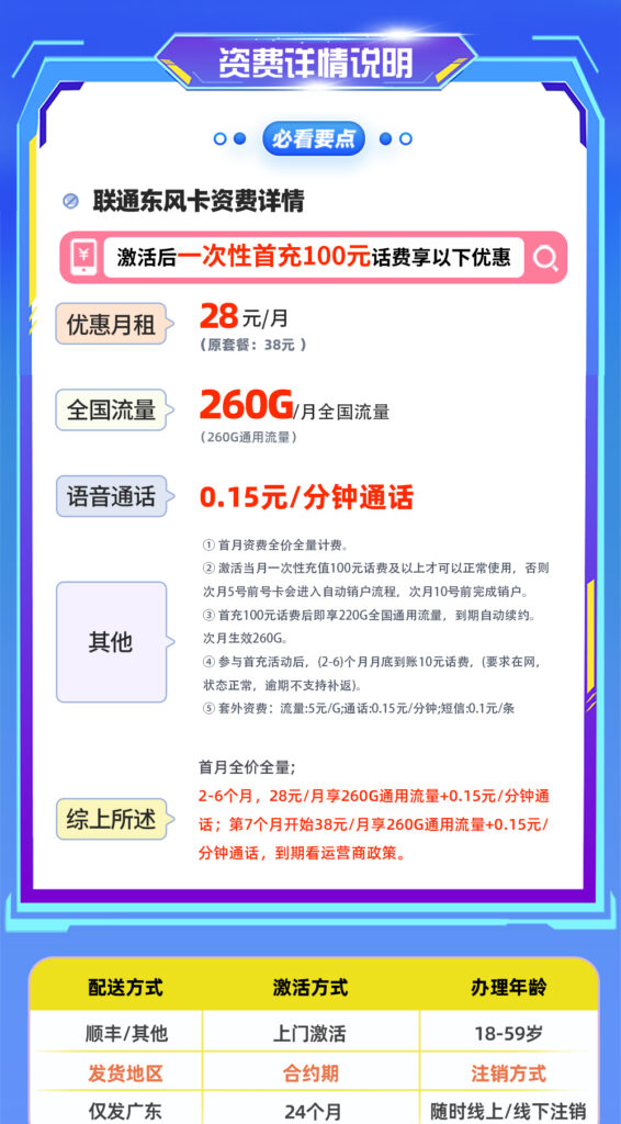 2年合约,提前销户有违约金。建议确定能长期在广东使用再办。广东联通流量卡套餐介绍:联通东风卡28元260G全国通用流量