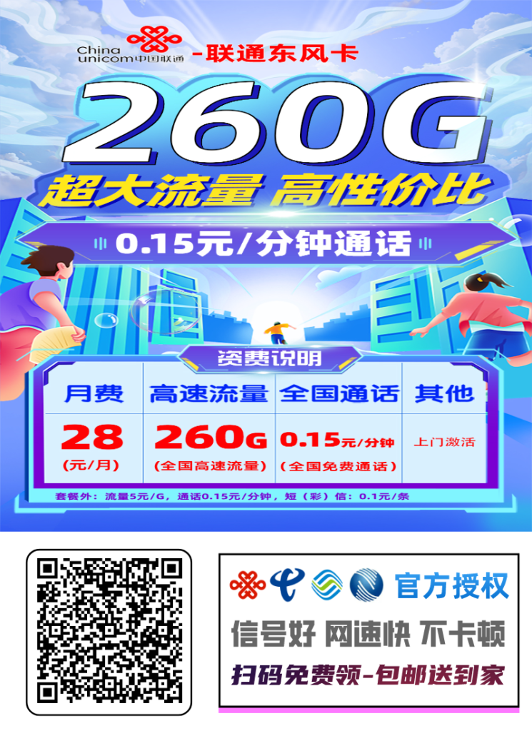2026新款广东联通套餐——东风卡正式上线,前6个月月租28元,含260G全国通用流量,通话0.15元/分钟。仅限广东省内申请,运营商正规发卡,官方可查,正规可实名。适合追求大流量、低月租、不在意免费通话的广东用户。