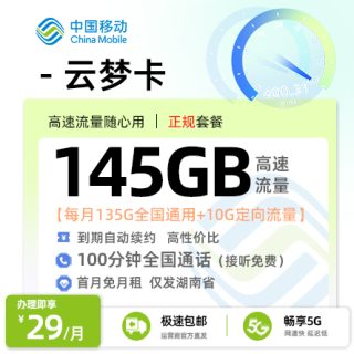 湖南移动套餐2025新套餐:移动云梦卡29元145G+100分钟,移动长期套餐推荐