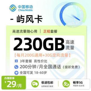 移动流量卡 2026年3月25日 由 浩子流量卡 由 浩子流量卡 · Published 2026年3月25日 移动屿风卡推荐:29元230G流量+200分钟通话,36个月超长优惠的移动神卡! 很多用户既想要移动的网络质量,又想要大流量和通话,还希望优惠期够长不...