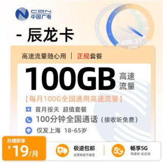 上海 / 广电流量卡 / 省内卡 2026年4月1日 由 浩子流量卡 由 浩子流量卡 · Published 2026年4月1日 上海广电辰龙卡体检:19元享100G通用流量+100分钟通话,上海用户专属 这张广电辰龙卡,第2-11个月每月仅需19元,就能享受100G全国通...